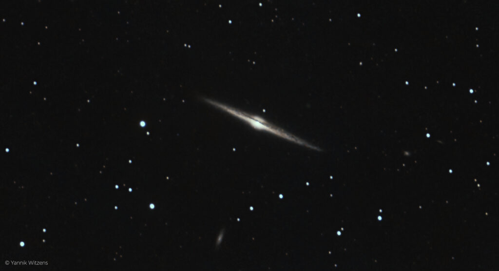 - Infos zum Objekt: Eine Spiralgalaxie im Sternbild Haar der Berenike, auf die wir von der Seite blicken. Daher ist in der Mitte ein Staubband zu sehen, das einen Teil des Lichts blockiert.