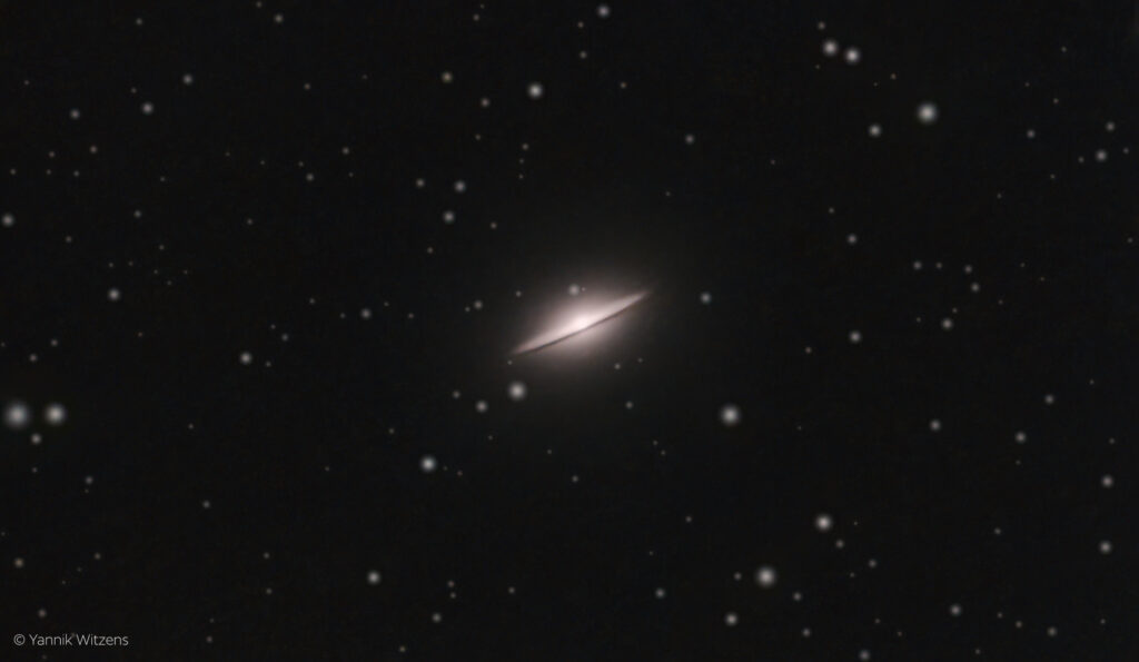 - Infos zum Objekt: Eine Spiralgalaxie im Sternbild Jungfrau, auf die wir von der Seite blicken. Daher ist in der Mitte ein Staubband zu sehen, das einen Teil des Lichts blockiert.