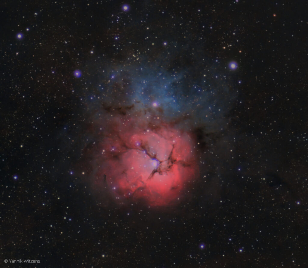 - Infos zum Objekt: Der rote Emissionsnebel wird von Staub verdunkelt und teilt den Nebel namensgebend in drei Teile. Darüber liegt ein blau leuchtender Reflexionsnebel.